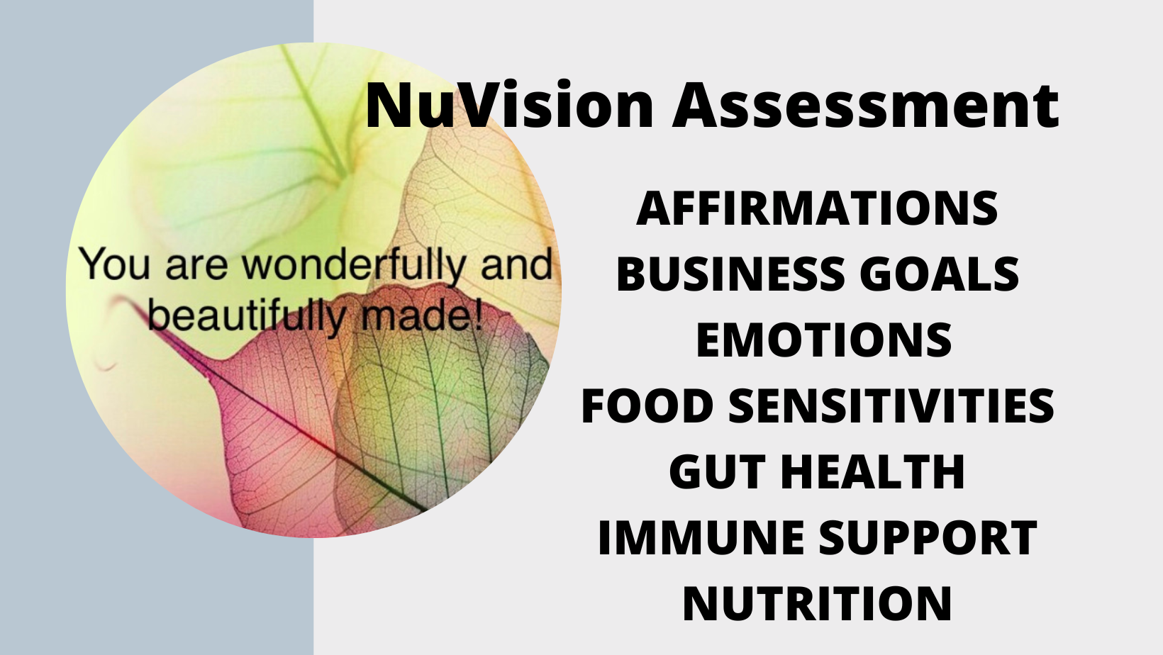 | Thermography A safe radiation, compression and pain free screening method helpful in breast cancer risk assessment as well as other health concerns. Other health concerns that may be observed by using thermography are: cardiovascular, neuromuscular, lymphatic, hormonal, thyroid and dental health. Schedule your appointment or call/text 224-358-2741. Please complete appropriate health forms before your visit. | NuVision Scans A quick mini scan to get the 10 ten overall health improvements or a full assessment to look at areas such as digestion, disease residue, emotions, nutrition, food allergies and sensitivities, sleep, environmental toxins, immune, pain, heavy metals, pathogens, geopathic stressors, and your specific conditions and their underlying causes and the support needed to enhance your well-being. Text “miniscan” to 224-805-5847 to schedule a mini Nuvision scan or “fullscan” to schedule your NuVision 1-hour comprehensive discovery session. |